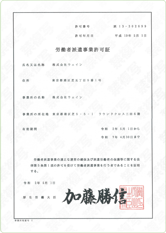 一般労働者派遣事業許可証