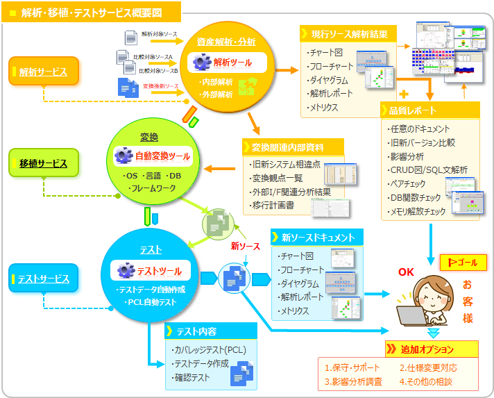 OS関連変換(同OS間、異OS間)、言語変換(同言語間、異言語間)、レガシー系 ⇒ OPEN系、C/S ⇒ WEB変換等 |